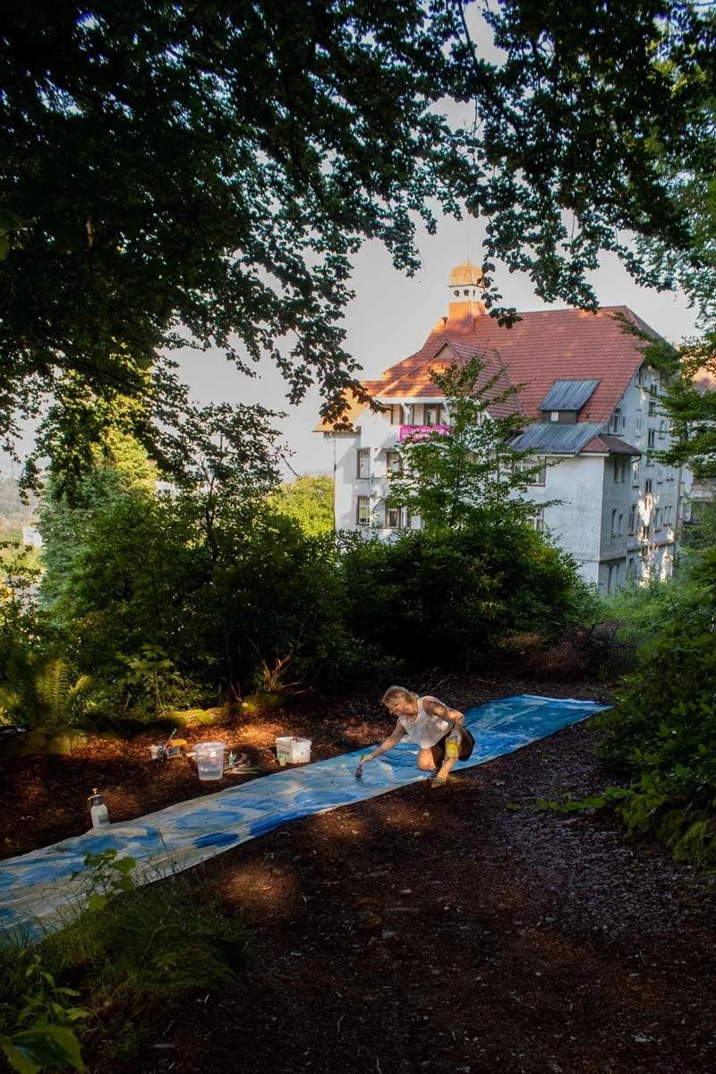 Die Besucher*innen befinden sich mitten in der begehbaren Kunst: Ein Teppich aus Malerei bedeckt den Glasbau, bemalte Stoffbahnen hängen von der Decke und wachsen zu Skulpturen in die Höhe. Mit Acrylfarbe hält Gruszeninks Bewegungen und alltägliche Geschichten in Linien, Flächen und Textfragmenten fest. Die ortsspezifische Arbeit entsteht direkt im Kalthaus, das für kurze Zeit ihr Atelier wird – ein Prozess, den die Besucherinnen live miterleben können.